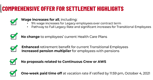 This morning, the Company emailed and hand-delivered its “Comprehensive Offer for Settlement” where we put our best foot forward to try to reach an agreement. The Company proposal is compelling in many ways, with significant enhancements for all employees and a first-ever one week off with pay from 10/5-10/11 if it is voted and ratified by midnight 10/4. (You can click through to the proposal highlights document on this page, below the negotiations updates.)